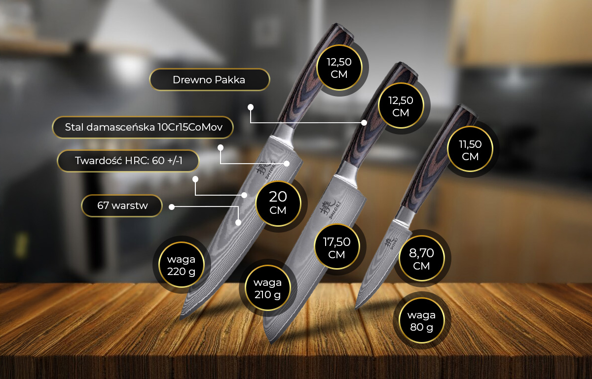 Noże ze stali damasceńskiej - zestaw najwyższej jakości