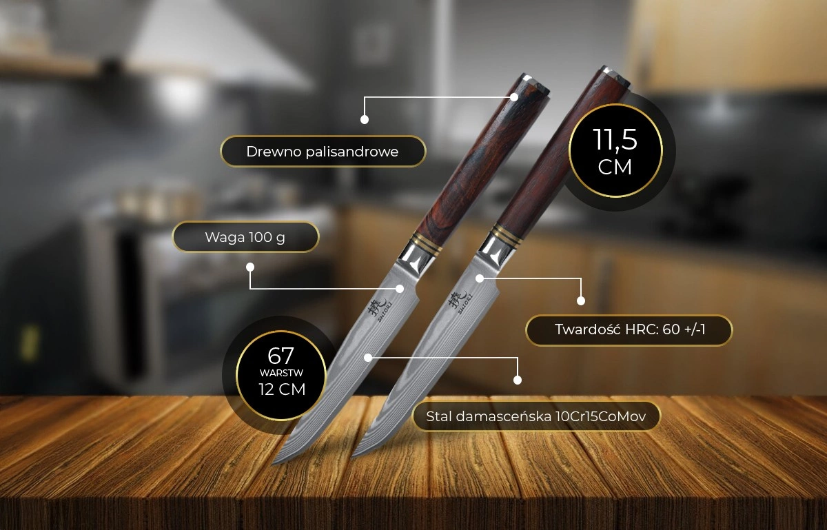 - Mistrzostwo japońskiego rzemiosła w Twojej kuchni. Noże z ostrzami z 67-warstwowej stali damasceńskiej i rękojeściami z palisandru to synonim elegancji i precyzji. Doskonałe do mięs, ryb, warzyw, a także jako idealny podarunek.