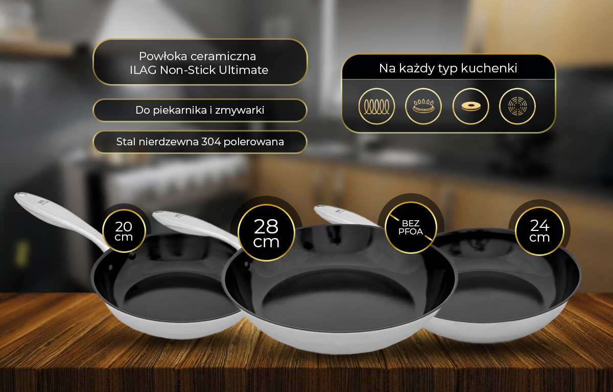 - Stainless Steel 304 zestaw patelni z powłoką ceramiczną indukcja 20 cm, 24 cm, 28 cm pokryte oryginalną szwajcarską powłoką ILAG Non-Stick Ultimate
