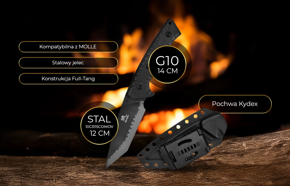 Tak. Konstrukcja full-tang, klinga o grubości 5 mm i stal 10Cr15CoMov o twardości około 60 HRC sprawiają, że nóż poradzi sobie z batonowaniem, podważaniem, porcjowaniem mięsa oraz wykonywaniem precyzyjnych cięć. Jest zaprojektowany jako narzędzie do realnego użytkowania, a nie dekoracja.