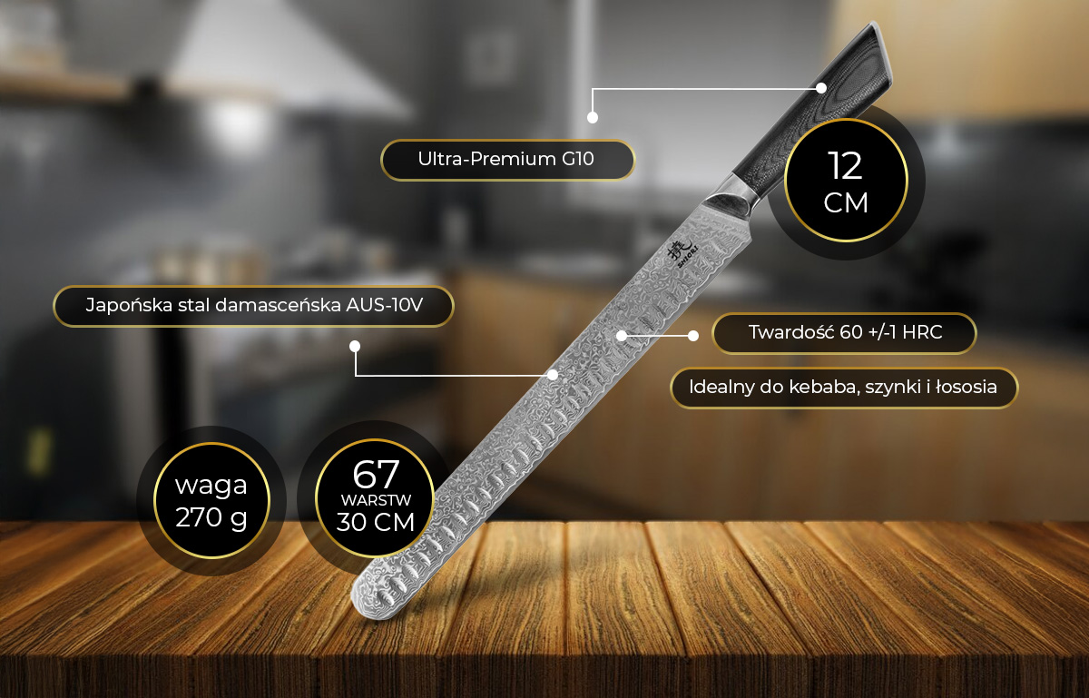 Ostrze wykonane jest z oryginalnej 67 warstwowej japońskiej stali damasceńskiej AUS-10V. Wielowarstwowość stali sprawia, że struktura różnych warstw każdego noża jest bardzo wytrzymała i elastyczna.Rękojeść wykonana jest z Ultra-Premium G10 co dodaje klasycznej elegancji. Połączenie bardzo dobrych surowców zapewnia unikalny produkt - sprężysty, twardy i ostry. Idealny nóż w każdej kuchni. Świetnie sprawdzi się w formie prezentu.
