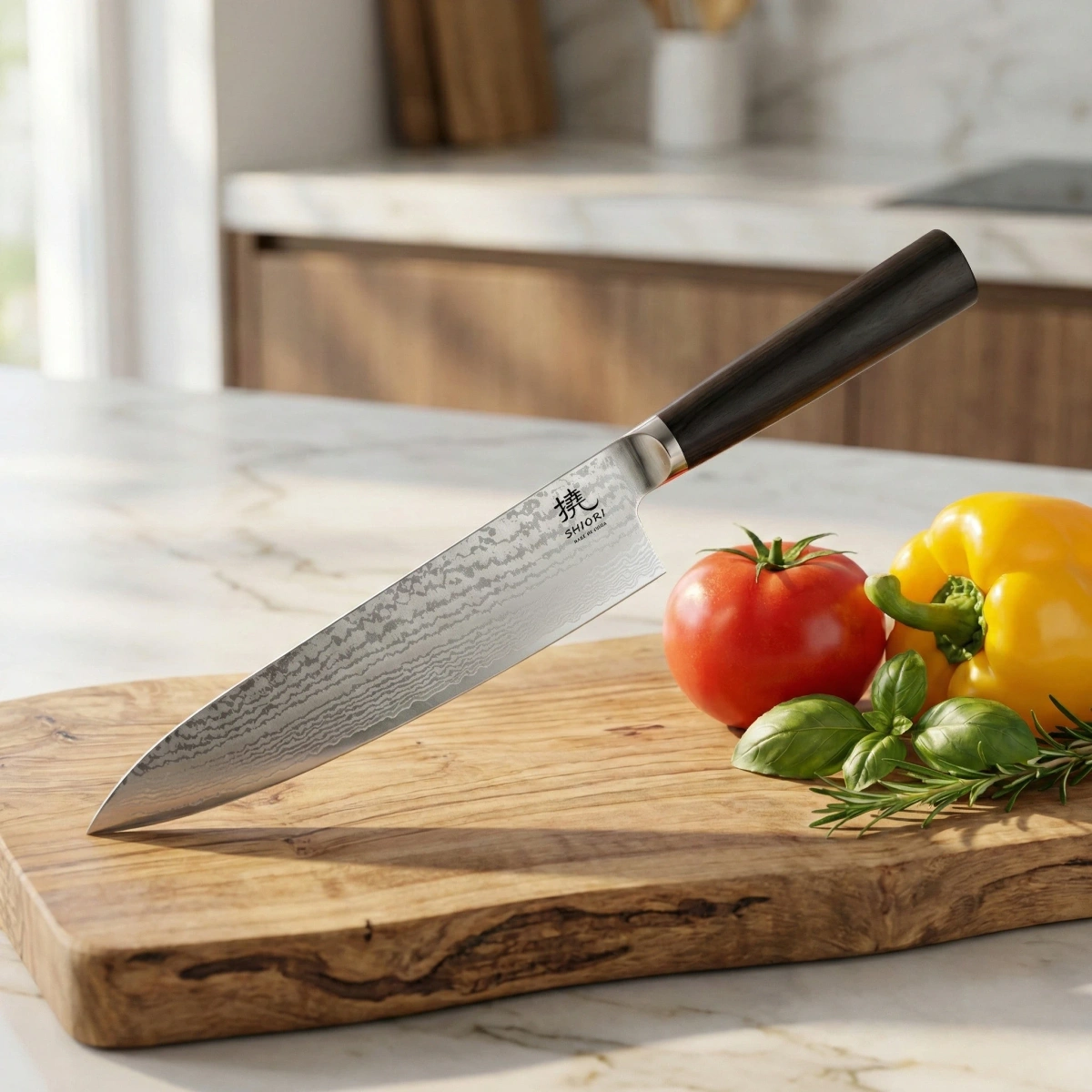 - Nóż Shiori z serii 撓 Kyoto Sifu, to dalszy rozwój klasycznego noża szefa kuchni z oryginalnej 33 warstwowej japońskiej stali damasceńskiej VG10.